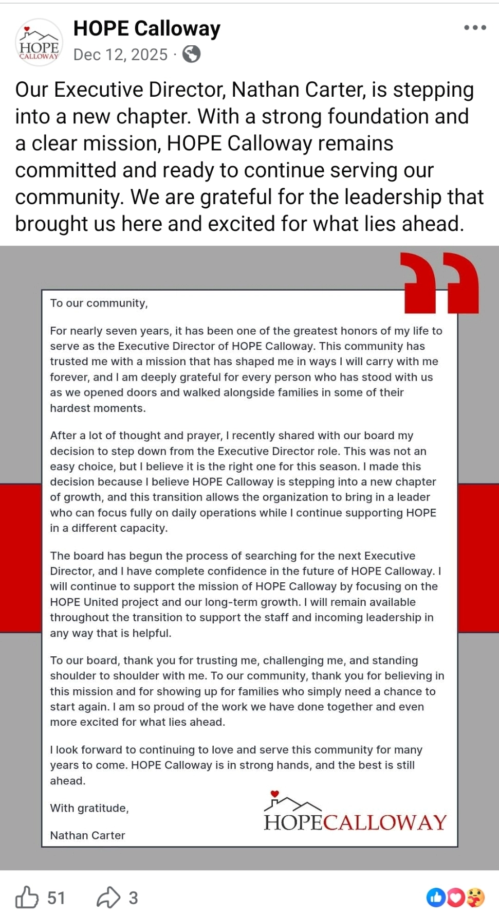 HOPE Calloway publicly announced Carter’s departure in a Dec. 12 social media post, sharing a letter in which he said he had decided to step down after “a lot of thought and prayer.” Carter described the decision as part of a transition to a “new chapter of growth” and said he would remain available to support staff and incoming leadership.